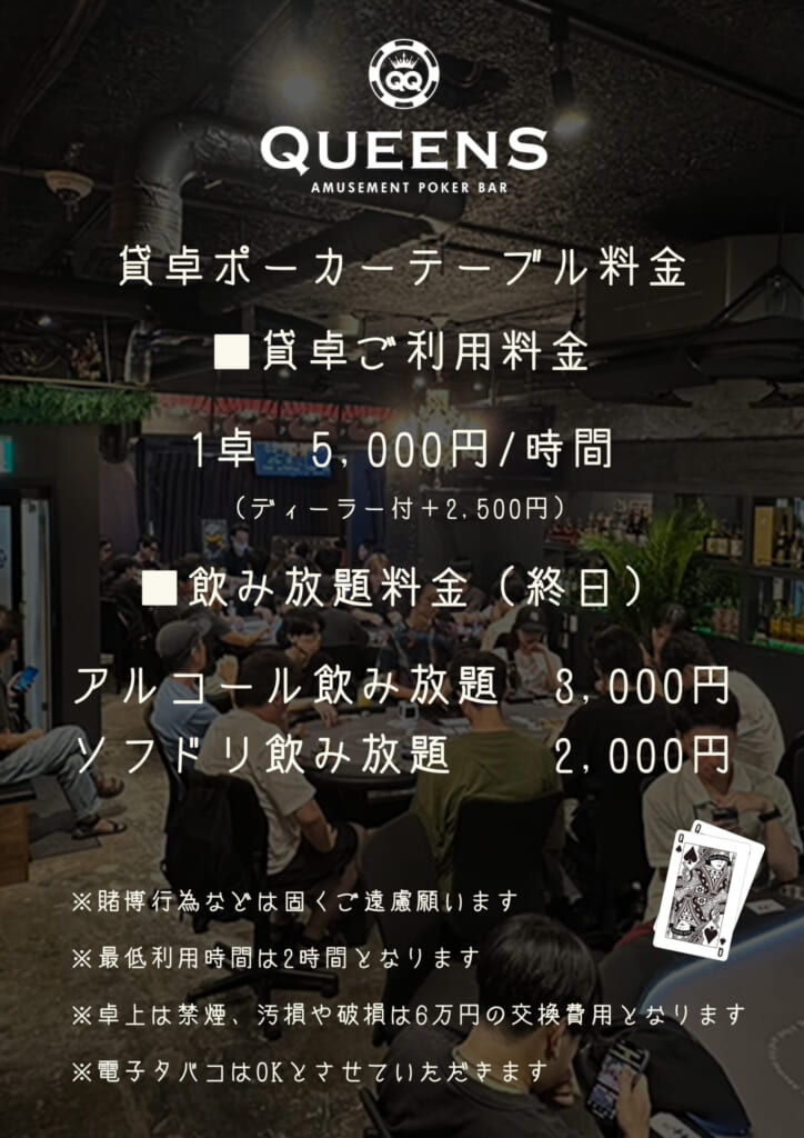 例:8名で5時間遊んだ場合(アルコール飲み放題、ディーラーなし)、貸卓料金25,000円+飲み放題24,000円=49,000円 お一人様当たり6,125円